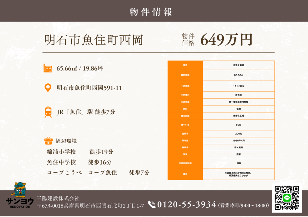 【明石市魚住町西岡】649万円/19.86坪/駅近【リノベプランあり】
