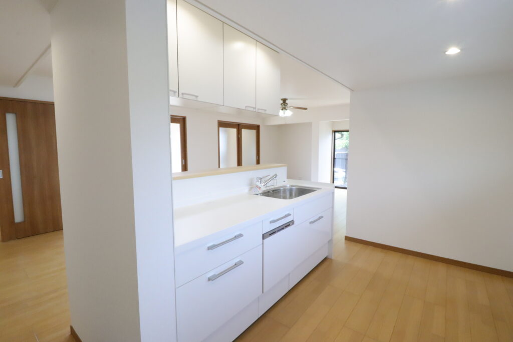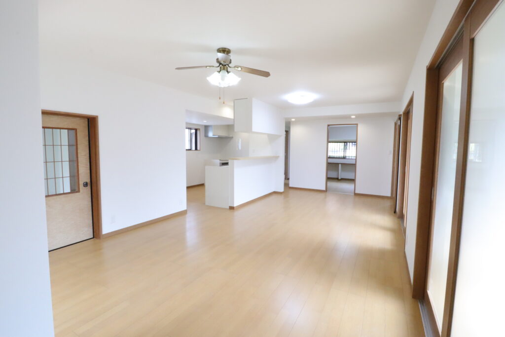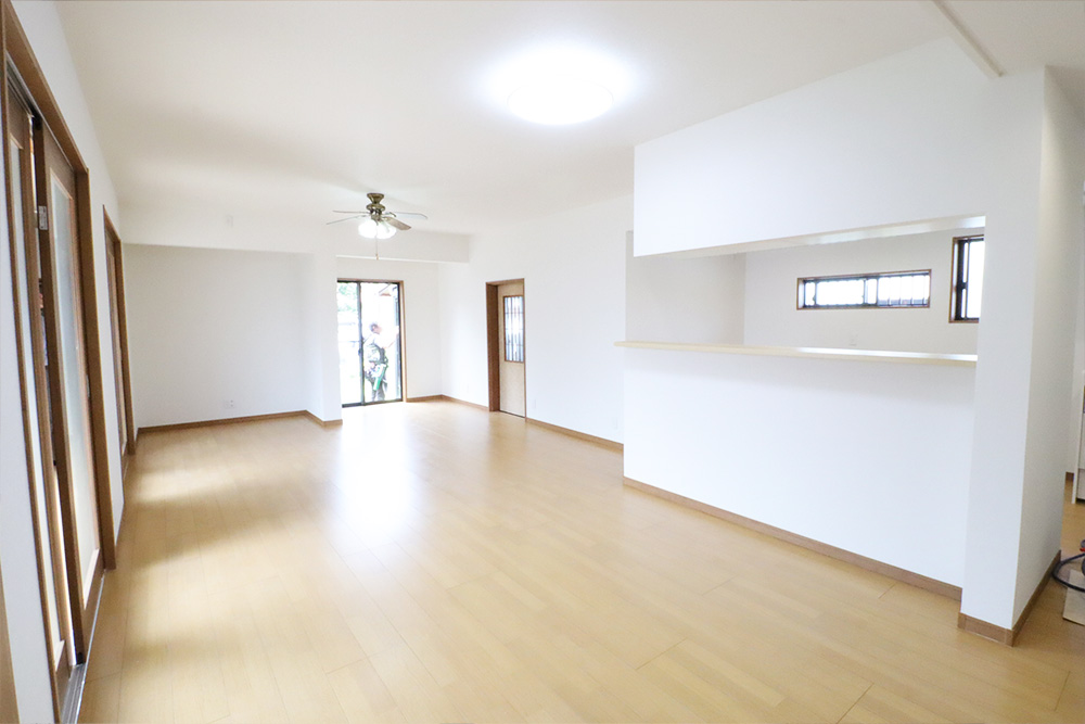 和室2間と風呂洗面所の壁と設備を撤去して、対面システムキツチンの配置場所を確保してLDKの間取りにしました。