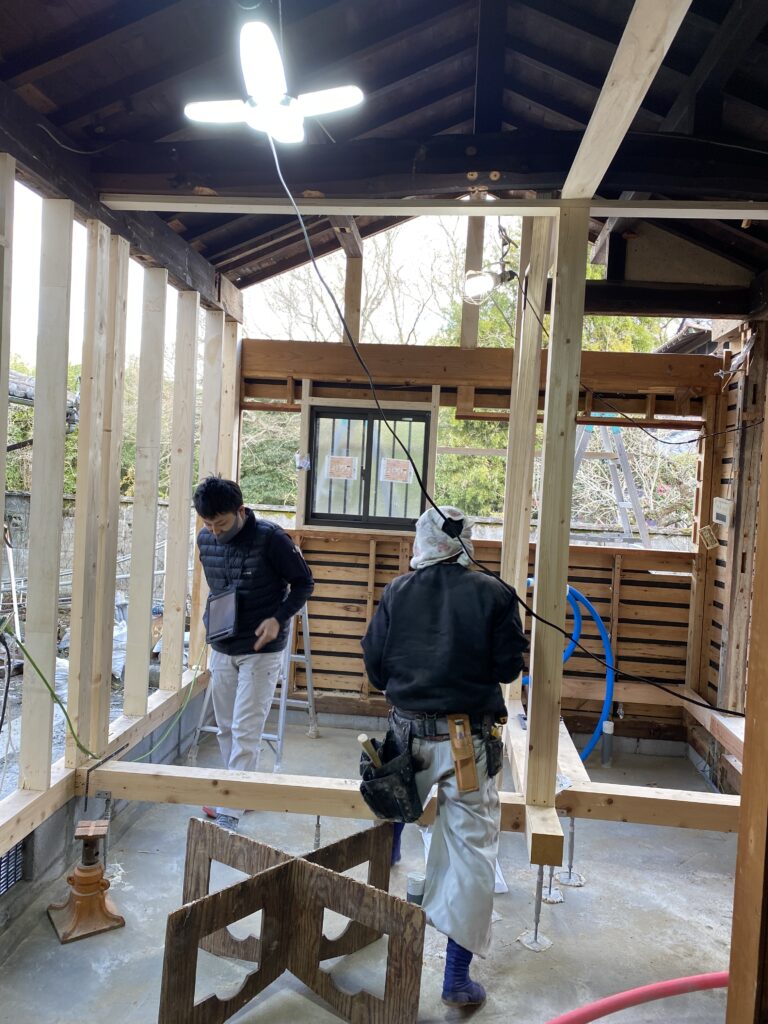 和室の床を全部解体して、基礎のない部分は基礎をして土台取付・床23㎜合板貼りで補強しました。壁は部分的に筋交取り付けました。
