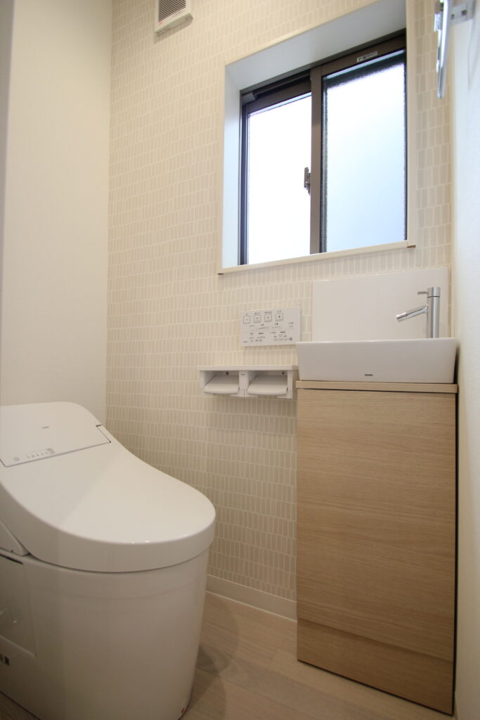 2階にリビングを持ってきたのでトイレを作りました、手洗い収納キャビネットを取付けシックリトしたクロス・洒落なタンクレス便器にしました。