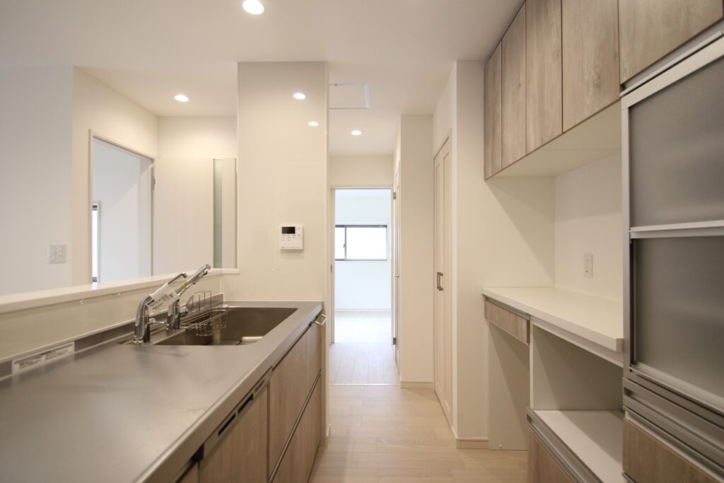 キッチンは家族の顔が見える対面式となり、料理中の会話も自然と増えると喜んでいただいています。
