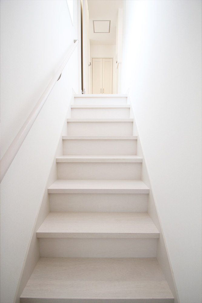 階段の配置を変えて、勾配がきつく危険な階段を勾配を緩くして手摺を付け安心で綺麗く明かりもさし込んできてます。