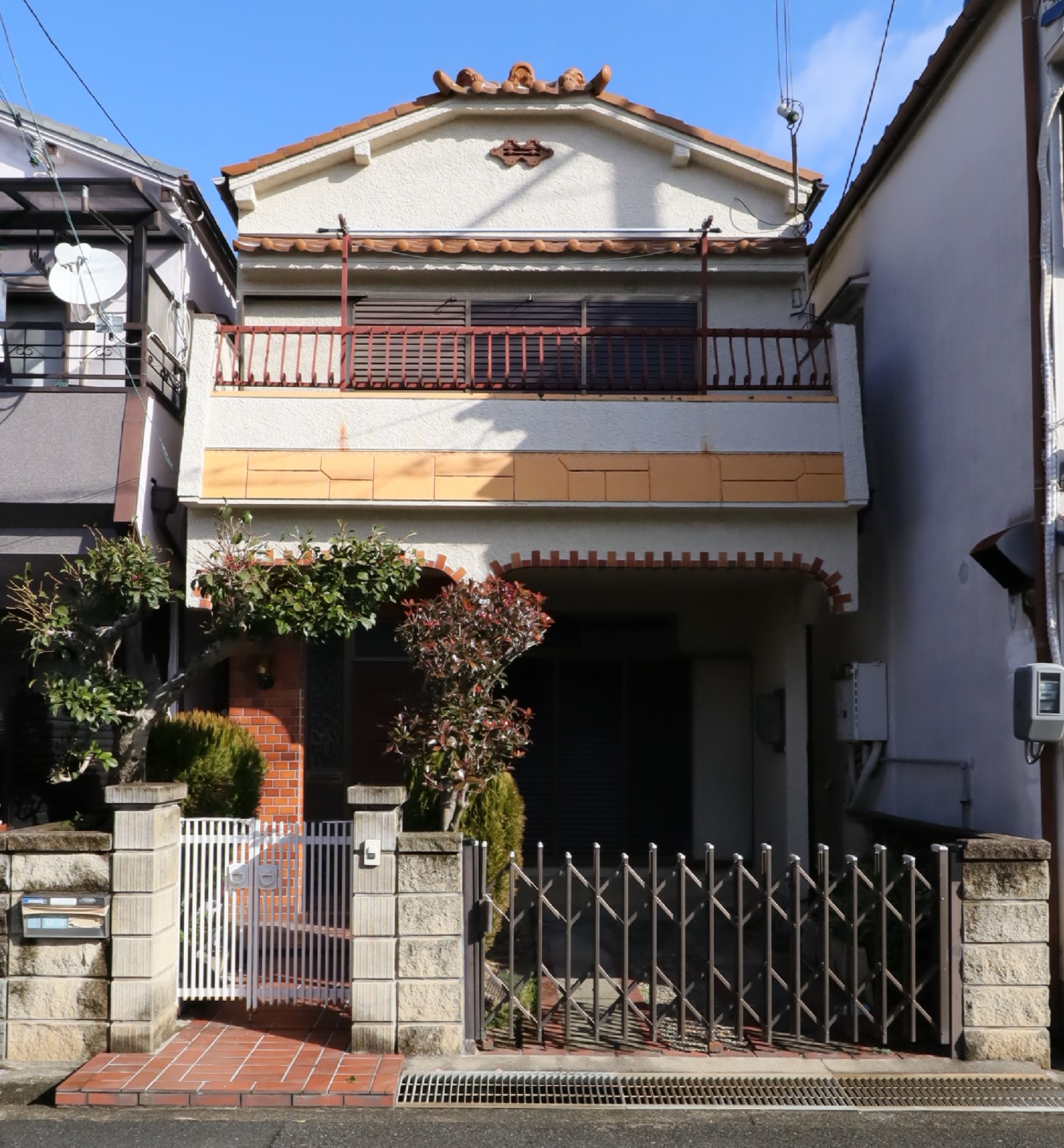 ガルバリウム鋼板の屋根、ベランダ無くしてスッキリとした外観・玄関ドアの取替え回りタイル貼り・植栽門扉を撤去して広々駐車スペース。