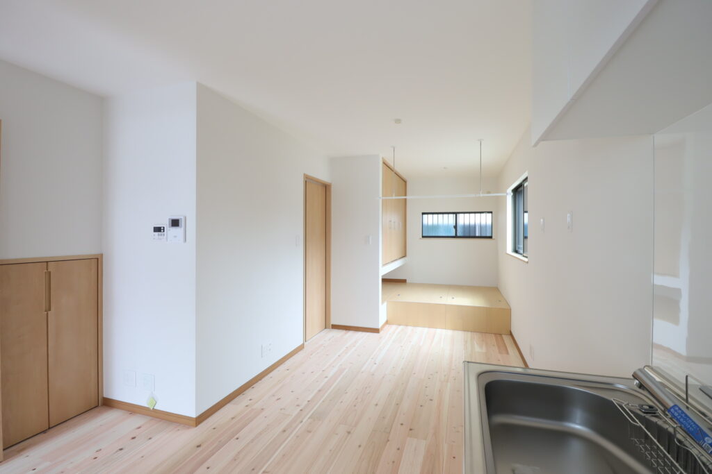 部屋の奥に合ったシッチンの位置を手前に移動して、使い勝手をよく考えた位置です。床は23㎜合板下地貼りの上に無垢材を貼りました。